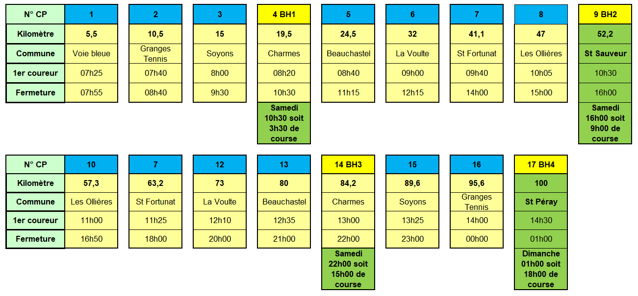 Pour garantir la sécurité des concurrents et la bonne entente avec les riverains et communes traversées, 3 barrières horaires sont positionnées au km 19,5 (3h30 de course), au demi-tour (km 52, 9h00 de course) et au km 84 (15h00 de course).